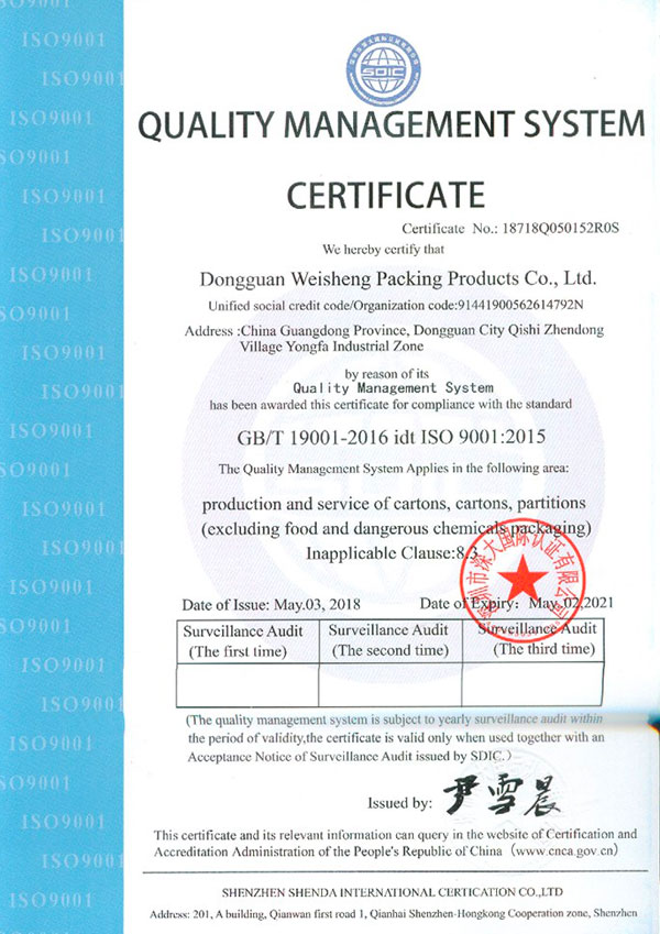 東莞市偉盛包裝制品有限公司成立于2010年,已通過ISO9001質量體系和ISO14001環境體系認證,公司占地面積5000平方米,十幾年的發展,公司一直致力于紙箱、紙盒、啤盒、彩盒、飛機盒等紙制品,廣泛應用于電子,家私、工藝品、燈飾、五金、塑膠等產品的包裝上,歡迎新老客戶致電垂詢。